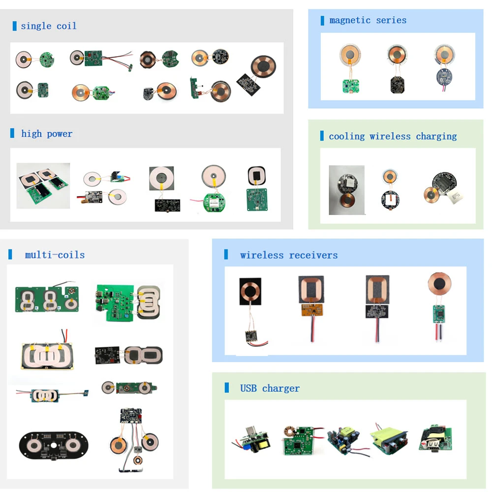 Therefore£¬we can customize ANY size pcb (the diameter of the coil ranges from 20~45 mm£©, ANY shape (the round circle, the semicircle, the sector), ANY charging distance (1~8 mm, 5~15mm, 20~30mm), ANY power ports (type A, type C, multiple ports), ANY output power (3W, 5W, 7.5W, 10W, 12W, 15W, 20W, 100W, 200W, 300W), ANY size receiver coil (diameter 10mm~55mm) and CUSTOMIZE multiple functions according to your requirements.?