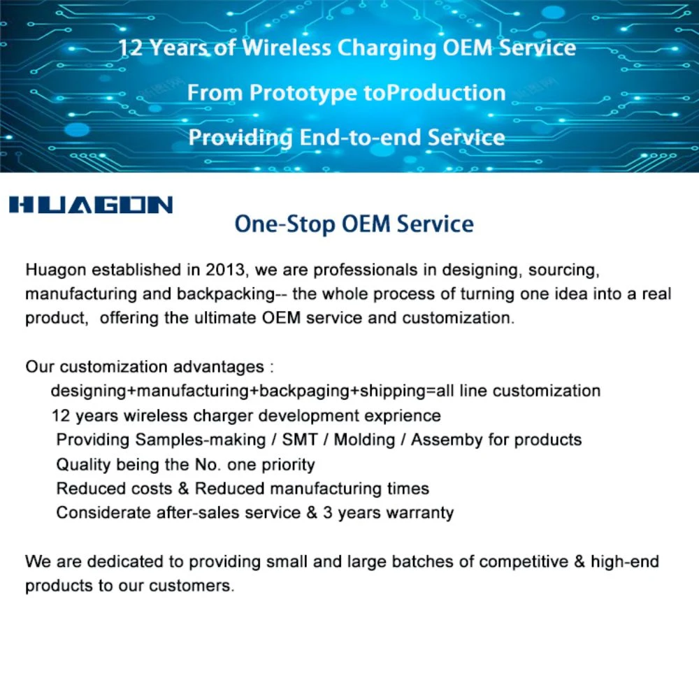 Huagon Technology has been delving into customization for our customers since 2013 and we have developed more than 300 kinds of mass production of wireless charging devices, ranging from phone wireless chargers£¬car wireless chargers£¬3 in 1 wireless chargers£¬ wireless charger pads, wireless charger desk lights, to multifunctional wireless chargers.